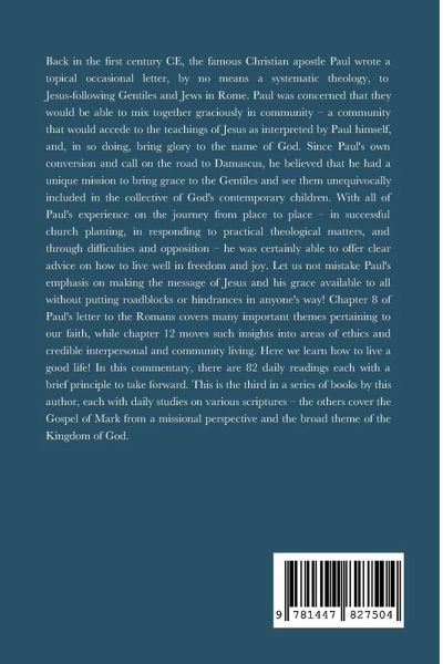 Back in the first century CE, the famous Christian apostle Paul wrote a topical occasional letter, by no means a systematic theology, to Jesus-following Gentiles and Jews in Rome. Paul was concerned that they would be able to mix together graciously in community - a community that would accede to the teachings of Jesus as interpreted by Paul himself, and, in so doing, bring glory to the name of God. Since Paul's own conversion and call on the road to Damascus, he believed that he had a unique mission to bring grace to the Gentiles and see them unequivocally included in the collective of God's contemporary children. With all of Paul's experience on the journey from place to place - in successful church planting, in responding to practical theological matters, and through difficulties and opposition - he was certainly able to offer clear advice on how to live well in freedom and joy. Let us not mistake Paul's emphasis on making the message of Jesus and his grace available to all without putting roadblocks or hindrances in anyone's way! Chapter 8 of Paul's letter to the Romans covers many important themes pertaining to our faith, while chapter 12 moves such insights into areas of ethics and credible interpersonal and community living. Here we learn how to live a good life! In this commentary, there are 82 daily readings each with a brief principle to take forward. This is the third in a series of books by this author, each with daily studies on various scriptures - the others cover the Gospel of Mark from a missional perspective and the broad theme of the Kingdom of God.