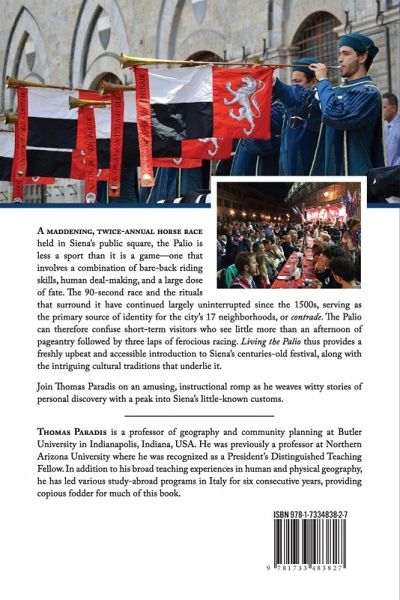 A maddening, twice-annual horse race held in Siena’s public square, the Palio is less a sport than it is a game—one that involves a combination of bare-back riding skills, human deal-making, and a large dose of fate. The 90-second race and the rituals that surround it have continued largely uninterrupted since the 1500s, serving as the primary source of identity for the city’s 17 neighborhoods, or contrade. The Palio can therefore confuse short-term visitors who see little more than an afternoon of pageantry followed by three laps of ferocious racing. Living the Palio thus provides a freshly upbeat and accessible introduction to Siena’s centuries-old festival, along with the intriguing cultural traditions that underlie it. Join Thomas Paradis on an amusing, instructional romp as he weaves witty stories of personal discovery with a peak into Siena’s little-known customs.