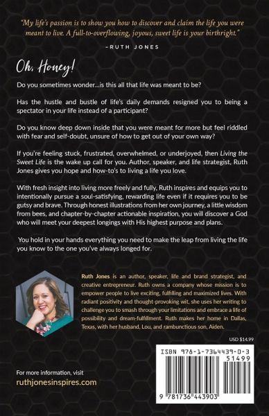 For readers of motivational books like DARING GREATLY, EVERYTHING IS FIGUREOUTABLE,and GIRL, WASH YOUR FACE, this growth mindset personal development book is for those who are ready to step out of average and live the exceptional life they were created to enjoy. Oh, Honey! Do you sometimes wonder...is this all that life was meant to be? Has the hustle and bustle of life's daily demands resigned you to being a spectator in your life instead of a participant? Do you know deep down inside that you were meant for more but feel riddled with fear and self-doubt, unsure of how to get out of your own way? If you're feeling stuck, frustrated, overwhelmed, or underjoyed, then Living the Sweet Life is the wake up call for you. Author, speaker, and life strategist, Ruth Jones gives you hope and how-to's to living a life you love. With fresh insight into living more freely and fully, Ruth inspires and empowers you to intentionally pursue a soul-satisfying and rewarding life even if it requires you to be gutsy and brave. Through honest illustrations from her own journey, a little wisdom from bees, and chapter-by-chapter actionable inspiration, you will discover a God who will meet your deepest longings with His highest purpose and plans. You hold in your hands everything you need to make the leap from living the life you know to the one you've always longed for. Perfect for readers of Untamed and Love Warrior by Glennon Doyle, Girl, Wash Your Face and Girl, Stop Apologizing by Rachel Hollis or listeners of The Goal Digger Podcast. On the professional side, if you liked Delivering Happiness by Tony Hsieh, you'll love Living the Sweet Life.