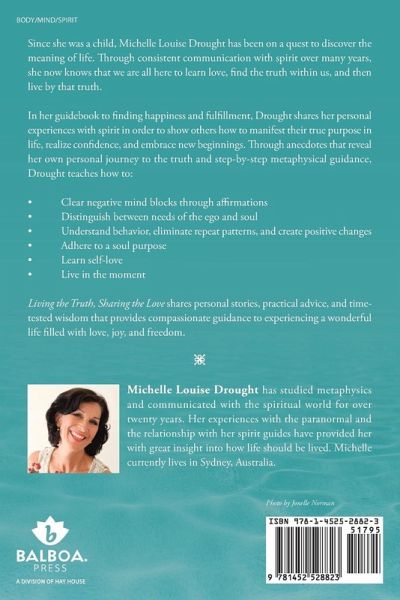 Since she was a child, Michelle Louise Drought has been on a quest to discover the meaning of life. Through consistent communication with spirit over many years, she now knows that we are all here to learn love, find the truth within us, and then live by that truth. In her guidebook to finding happiness and fulfillment, Drought shares her personal experiences with spirit in order to show others how to manifest their true purpose in life, realize confidence, and embrace new beginnings. Through anecdotes that reveal her own personal journey to the truth and step-by-step metaphysical guidance, Drought teaches how to: ¿ Clear negative mind blocks through affirmations ¿ Distinguish between needs of the ego and soul ¿ Understand behavior, eliminate repeat patterns, and create positive changes ¿ Adhere to a soul purpose ¿ Learn self-love ¿ Live in the moment Living the Truth, Sharing the Love shares personal stories, practical advice, and timetested wisdom that provides compassionate guidance to experiencing a wonderful life filled with love, joy, and freedom.