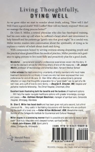 Most persons, especially as they are aging, wonder, "How will I die? Will I have a good death? Will I suffer? How will my family respond? How can we manage the dying process better?" Author Dr. Glen Miller, a retired physician, had his own wake-up call when he suffered a heart attack and determined to help himself and his patients go "gently into that good night." Dr. Miller emphasizes that good preparation for the inevitable-by individuals and their families-will ease this transitional time of high stress and high emotion. The book brings a unique perspective related to the author's professional career and personal medical history-doctor of internal medicine who cared for dying patients, healthcare administrator who understands how the healthcare system works, and Christian who thinks that dying can be a natural part of life. All of this is in the context of the author's own healthcare narrative and his personal search for a good death. With compassion honed by serving overseas among poor and despairing people and the practical ideas gleaned from his medical practice, Dr. Miller provides rich guidance to aging persons to live more fully and to proactively plan for a good death. 172 Pages.