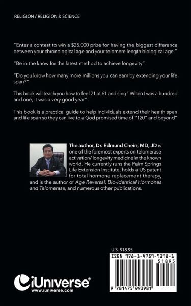 "Enter a contest to win a $25,000 prize for having the biggest difference between your chronological age and your telomere length biological age." "Be in the know for the latest method to achieve longevity" "Do you know how many more millions you can earn by extending your life span?" " How can a "Steak" and a " Fortune Cookie " share a common view on Living to 120 and Beyond.." This book will teach you how to feel 21 at 61 and sing" When I was a hundred and one, it was a very good year". This book is a practical guide to help individuals extend their health span and life span so they can live to a God promised time of "120" and beyond"