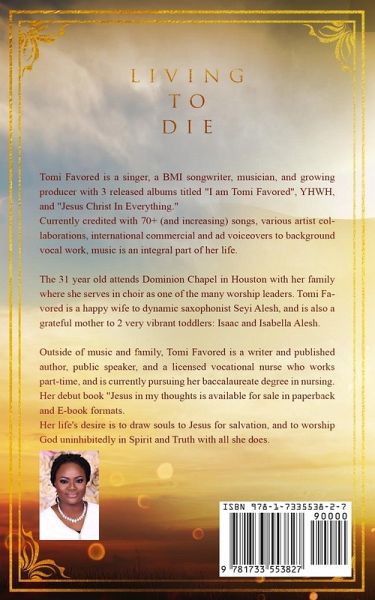 About the author: Tomi Favored is a singer, a BMI songwriter, musician, and growing producer with 3 released albums titled "I am Tomi Favored", YHWH, and "Jesus Christ In Everything." Currently credited with 70+ (and increasing) songs, various artist collaborations, international commercial and ad voiceovers to background vocal work, music is an integral part of her life. The 31 year old attends Dominion Chapel in Houston with her family where she serves in choir as one of the many worship leaders. Tomi Favored is a happy wife to dynamic saxophonist Seyi Alesh, and is also a grateful mother to 2 very vibrant toddlers: Isaac and Isabella Alesh. Outside of music and family, Tomi Favored is a writer and published author, public speaker, and a licensed vocational nurse who works part-time, and is currently pursuing her baccalaureate degree in nursing. Her debut book "Jesus in my thoughts is available for sale in Paperback and E-book formats. Her life's desire is to draw souls to Jesus for salvation, and to worship God uninhibitedly in Spirit and Truth with all she does.