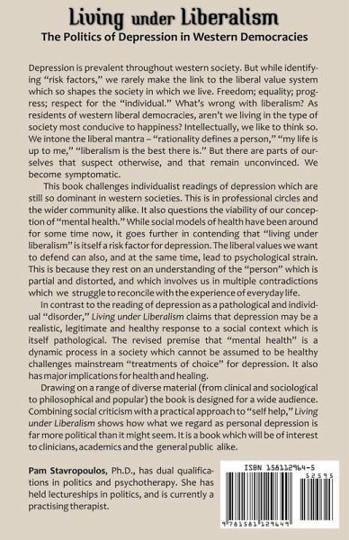 Depression is prevalent throughout western society. But while identifying "risk factors," we rarely make the link to the liberal value system which so shapes the society in which we live. Freedom; equality; progress; respect for the "individual." What's wrong with liberalism? As residents of western liberal democracies, aren't we living in the type of society most conducive to happiness? Intellectually, we like to think so. We intone the liberal mantra "rationality defines a person," "my life is up to me," "liberalism is the best there is." But there are parts of ourselves that suspect otherwise, and that remain unconvinced. We become symptomatic. This book challenges individualist readings of depression which are still so dominant in western societies. This is in professional circles and the wider community alike. It also questions the viability of our conception of "mental health." While social models of health have been around for some time now, it goes further in contending that "living under liberalism" is itself a risk factor for depression. The liberal values we want to defend can also, and at the same time, lead to psychological strain. This is because they rest on an understanding of the "person" that is partial and distorted, and which involves us in multiple contradictions which we struggle to reconcile with the experience of everyday life. In contrast to the reading of depression as a pathological and individual "disorder," Living under Liberalism claims that depression may be a realistic, legitimate and healthy response to a social context which is itself pathological. The revised premise that "mental health" is a dynamic process in a society which cannot be assumed to be healthy challenges mainstream "treatments of choice" for depression. It also has major implications for health and healing. Drawing on a range of diverse material (from clinical and sociological to philosophical and popular) the book is designed for a wide audience. Combining social criticism with a practical approach to "self help," Living under Liberalism shows how what we regard as personal depression is far more political than it might seem. It is a book which will be of interest to clinicians, academics and the general public alike.