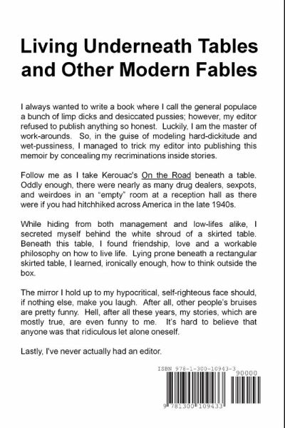 I always wanted to write a book where I call the general populace a bunch of limp dicks and desiccated pussies; however, my editor refused to publish anything so honest. Luckily, I am the master of work-arounds. So, in the guise of modeling hard-dickitude and wet-pussiness, I managed to trick my editor into publishing this memoir by concealing my recriminations inside stories. Follow me as I take Kerouac's On the Road beneath a table. Oddly enough, there were nearly as many drug dealers, sexpots, and weirdoes in an "empty" room at a reception hall as there were if you had hitchhiked across America in the late 1940s. While hiding from both management and low-lifes alike, I secreted myself behind the white shroud of a skirted table. Beneath this table, I found friendship, love and a workable philosophy on how to live life. Lying prone beneath a rectangular skirted table, I learned, ironically enough, how to think outside the box. Also, I've never actually had an editor.
