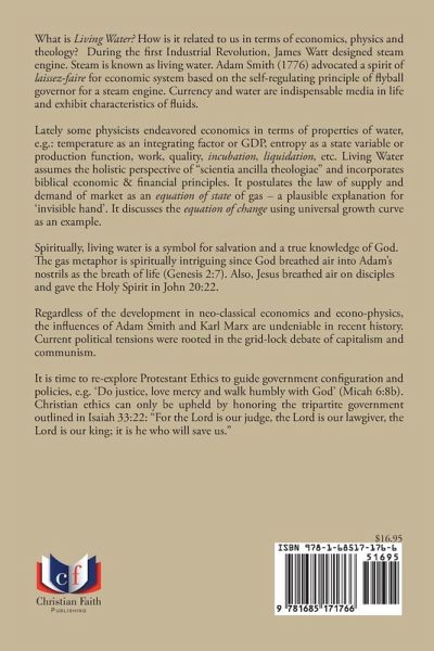 What is Living Water? How is it related to us in terms of economics, physics and theology? During the first Industrial Revolution, James Watt designed steam engine. Steam is known as living water. Adam Smith (1776) advocated a spirit of laissez-faire for economic system based on the self-regulating principle of flyball governor for a steam engine. Currency and water are indispensable media in life and exhibit characteristics of fluids. Lately some physicists endeavored economics in terms of properties of water, e.g.: temperature as an integrating factor or GDP, entropy as a state variable or production function, work, quality, incubation, liquidation, etc. Living Water assumes the holistic perspective of "scientia ancilla theologiae" and incorporates biblical economic & financial principles. It postulates the law of supply and demand of market as an equation of state of gas - a plausible explanation for 'invisible hand'. It discusses the equation of change using universal growth curve as an example. Spiritually, living water is a symbol for salvation and a true knowledge of God. The gas metaphor is spiritually intriguing since God breathed air into Adam's nostrils as the breath of life (Genesis 2:7). Also, Jesus breathed air on disciples and gave the Holy Spirit in John 20:22. Regardless of the development in neo-classical economics and econo-physics, the influences of Adam Smith and Karl Marx are undeniable in recent history. Current political tensions were rooted in the grid-lock debate of capitalism and communism. It is time to re-explore Protestant Ethics to guide government configuration and policies, e.g. 'Do justice, love mercy and walk humbly with God' (Micah 6:8b). Christian ethics can only be upheld by honoring the tripartite government outlined in Isaiah 33:22: "For the Lord is our judge, the Lord is our lawgiver, the Lord is our king; it is he who will save us."