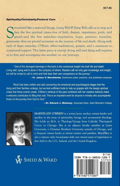 Structured like a stational liturgy, Living Well & Dying Well calls us to stop and face the five spiritual crises-faith, despair, impatience, pride, and greed-and five remedies-inspiration, hope, patience, humility, and generosity-that are pivotal moments on the journey of life and death. Along with each of these remedies, O'Brien offers meditations, prayers, and a summons to communal support. This latter piece is crucial-living well and dying well requires us to love and accompany one another in our journeys.