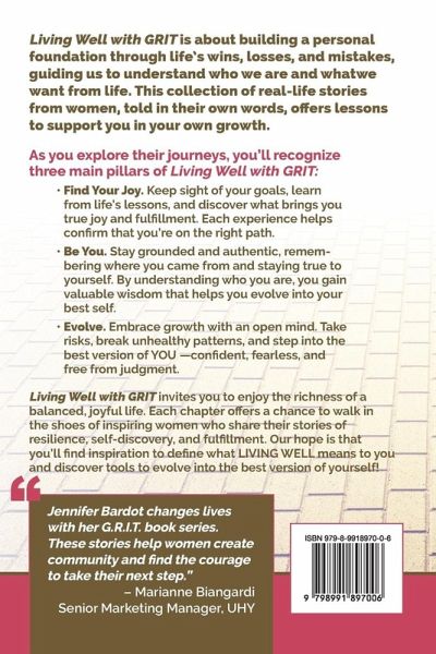 Living Well with GRIT is about building a personal foundation through life's wins, losses, and mistakes, guiding us to understand who we are and whatwe want from life. This collection of real-life stories from women, told in their own words, offers lessons to support you in your own growth. As you explore their journeys, you'll recognize three main pillars of Living Well with GRIT: ¿ Find Your Joy. Keep sight of your goals, learn from life's lessons, and discover what brings you true joy and fulfillment. Each experience helps confirm that you're on the right path. ¿ Be You. Stay grounded and authentic, remembering where you came from and staying true to yourself. By understanding who you are, you gain valuable wisdom that helps you evolve into your best self. ¿ Evolve. Embrace growth with an open mind. Take risks, break unhealthy patterns, and step into the best version of YOU -confident, fearless, and free from judgment. Living Well with GRIT invites you to enjoy the richness of a balanced, joyful life. Each chapter offers a chance to walk in the shoes of inspiring women who share their stories of resilience, self-discovery, and fulfillment. Our hope is that you'll find inspiration to define what LIVING WELL means to you and discover tools to evolve into the best version of yourself!