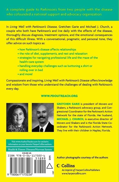 A complete guide to Parkinson's from two people with the disease who cofounded a national support and advocacy organization. In Living Well with Parkinson's Disease, Gretchen Garie and Michael J. Church, a couple who both have Parkinson's and live daily with the effects of the disease, thoroughly discuss diagnosis, treatment options, and the emotional consequences of this difficult illness. With a conversational, pragmatic, and personal tone, they offer advice on such topics as: how Parkinson's disease affects relationships the role of diet, supplements, and rest and relaxation strategies for navigating professional life and the maze of the health-care system handling everyday challenges such as buttoning a shirt or rolling over in bed and more! Compassionate and inspiring, Living Well with Parkinson's Disease offers knowledge and wisdom from those who understand the challenges of dealing with Parkinson's every day.