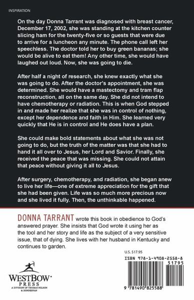 On the day Donna Tarrant was diagnosed with breast cancer, December 17, 2002, she was standing at the kitchen counter slicing ham for the twenty-five or so guests that were due to arrive for a luncheon any minute. The phone call left her speechless. The doctor told her to buy green bananas; she would be alive to eat them! Any other time, she would have laughed out loud. Now, she was going to die. After half a night of research, she knew exactly what she was going to do. After the doctor's appointment, she was determined. She would have a mastectomy and tram flap reconstruction, all on the same day. She did not intend to have chemotherapy or radiation. This is when God stepped in and made her realize that she was in control of nothing, except her dependence and faith in Him. She learned very quickly that He is in control and He does have a plan. She could make bold statements about what she was not going to do, but the truth of the matter was that she had to hand it all over to Jesus, her Lord and Savior. Finally, she received the peace that was missing. She could not attain that peace without giving it all to Jesus. After surgery, chemotherapy, and radiation, she began anew to live her life-one of extreme appreciation for the gift that she had been given. Life was so much more precious now and she lived it fully. Then, the unthinkable happened.