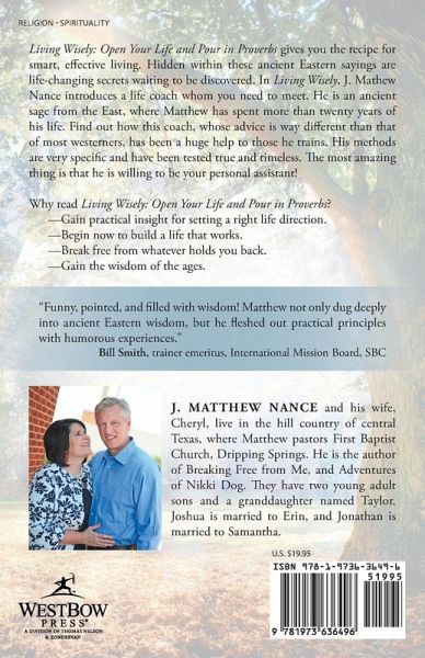 Living Wisely: Open Your Life and Pour in Proverbs gives you the recipe for smart, effective living. Hidden within these ancient Eastern sayings are life-changing secrets waiting to be discovered. In Living Wisely, J. Mathew Nance introduces a life coach whom you need to meet. He is an ancient sage from the East, where Matthew has spent more than twenty years of his life. Find out how this coach, whose advice is way different than that of most westerners, has been a huge help to those he trains. His methods are very specific and have been tested true and timeless. The most amazing thing is that he is willing to be your personal assistant! Why read Living Wisely: Open Your Life and Pour in Proverbs? Gain practical insight for setting a right life direction. Begin now to build a life that works. Break free from whatever holds you back. Gain the wisdom of the ages. Funny, pointed, and filled with wisdom! Matthew not only dug deeply into ancient Eastern wisdom, but he fleshed out practical principles with humorous experiences. Bill Smith, trainer emeritus, International Mission Board, SBC