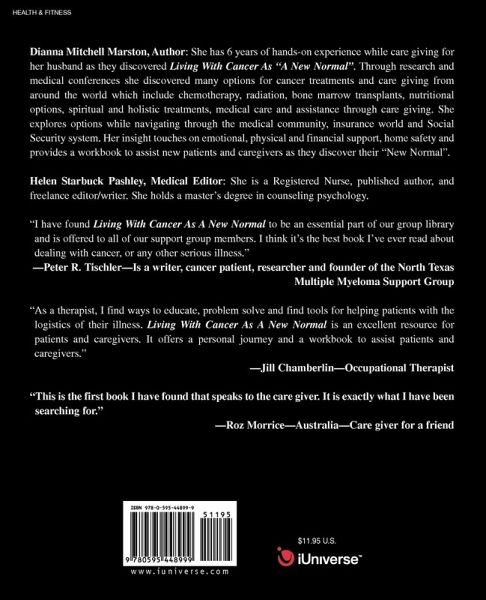 Dianna Mitchell Marston, Author: She has 6 years of hands-on experience while care giving for her husband as they discovered Living With Cancer as "A New Normal". Through research and medical conferences she discovered many options for cancer treatments and care giving from around the world which include chemotherapy, radiation, bone marrow transplants, nutritional options, spiritual and holistic treatments, medical care and assistance through care giving. She explores options while navigating through the medical community, insurance world and Social Security system. Her insight touches on emotional, physical and financial support, home safety and provides a workbook to assist new patients and caregivers as they discover their "New Normal". Helen Starbuck Pashley, Medical Editor: She is a Registered Nurse, published author, and freelance editor/writer. She holds a master's degree in counseling psychology. "I have found Living With Cancer as "A New Normal" to be an essential part of our group library and is offered to all of our support group members. I think it's the best book I've ever read about dealing with cancer, or any other serious illness."-Peter R. Tischler-Is a writer, cancer patient, researcher and founder of the North Texas Multiple Myeloma Support Group "As a therapist, I find ways to educate, problem solve and find tools for helping patients with the logistics of their illness. Living With Cancer as "A New Normal" is an excellent resource for patients and caregivers. It offers a personal journey and a workbook to assist patients and caregivers."-Jill Chamberlin-Occupational Therapist