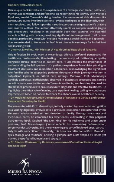 This unique book introduces the experiences of a distinguished leader, politician, mentor, academician, and professional as he navigates his journey with Multiple Myeloma, amidst Tanzania's rising burden of non-communicable diseases like cancer. Structured into three sections-events leading up to the diagnosis, treat - ment received, and follow-ups-the narrative portrays a unique patient's bravery and positive outlook. The author effectively simplifies complex medical jargon and procedures, resulting in an accessible book that captures the essential aspects of living with cancer, providing significant encouragement to all cancer patients, particularly those with multiple myeloma. Special thanks and appreciation are extended to Honourable Prof. Mark James Mwandosya for his brilliant and inspiring work - Ummy A. Mwalimu, MP, Minister of Health United Republic of Tanzania This reflection by Prof. Mark J Mwandosya offers a profound perspective for healthcare professionals, illuminating the necessity of cultivating empathy alongside clinical expertise in patient care. It underscores the importance of understanding the full spectrum of a patient's experience, from history-taking to treatment decisions and medication adherence, acknowledging the significant role families play in supporting patients throughout their journey-whether in outpatient, inpatient, or critical care settings. Moreover, Prof. Mwandosya candidly addresses inefficiencies observed in diagnostic processes and service coordination across institutions in Tanzania and India, emphasizing the need for streamlined procedures to ensure accurate diagnosis and effective treatment. He highlights the critical role of nursing care in patient healing, calling for continuous improvement based on patient feedback to enhance overall healthcare delivery - Dr. Mpoki Ulinyelusya, High Commissioner of Tanzania to Canada, and Former Permanent Secretary for Health The encounter with Prof. Mwandosya, initially marked by ceremonial recognition as a visiting dignitary, evolved into a profound connection characterized by his kindness, scholarly wisdom, and devotion to family. Through snapshots and meticulous notes, he chronicled his experiences, culminating in this poignant diary-turned-book. Dubbed "the Lion King" for his resilience and grace under pressure, Prof. Mwandosya's journal reflects his unwavering determination, serenity amidst adversity, and the unwavering support of his loved ones, particularly his wife and children. Ultimately, this book is a reflection of Prof. Mwando-sya's courage and resilience, offering a glimpse into a life shaped by illness yet marked by profound humanity and strength - Dr. Srinivas Chakravarthy Gumaraju, a renowned Consultant Haematologist and Oncologist