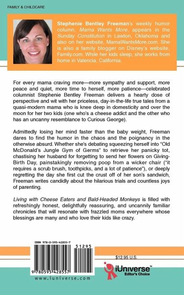 For every mama craving more-more sympathy and support, more peace and quiet, more time to herself, more patience-celebrated columnist Stephenie B. Freeman delivers a hearty dose of perspective and wit with her priceless, day-in-the-life true tales from a mama knee deep in dirty diapers and over the moon for her two kids (the cheese addict and the one with an uncanny resemblance to Curious George). Admittedly losing her mind faster than her baby fat, Freeman dares to find the humor in the chaos and the poignancy in the otherwise absurd. Whether she's debating squeezing herself into "Old McDonald's Jungle Gym of Germs" to retrieve her panicky tot, chastising her husband for forgetting to send her flowers on giving-birth day, painstakingly removing poop from a wicker chair ("it requires a scrub brush, toothpicks, and a lot of patience"), or deeply regretting the day she first cut the crust off of her son's sandwich, Freeman writes candidly about the hilarious trials and countless joys of parenting. Freeman's refreshingly honest, delightfully reassuring, and uncannily familiar chronicles will resonate with frazzled moms everywhere whose blessings are many and who love their kids like crazy.