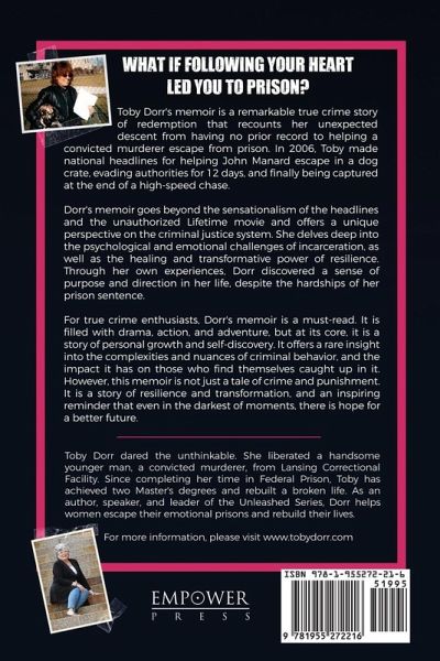 The real-life story behind the upcoming Lifetime Movie "Jailbreak Lovers". Having never had so much as a traffic ticket, Toby Dorr shattered her mold of perfection by helping a convicted murderer, a trainer in her prison dog program, escape in a dog crate. Her story is a lesson in perspective. Instead of focusing on everything she lost, Dorr made a conscious choice to use her twenty-seven months in prison as a period to reflect on her life, heal emotional wounds, plot a course for the future, and embrace the sisterhood of women she encountered behind bars. Far from easy, her prison sentence was gut-wrenching and devastating. But a pivoting revelation during a stay in suicide watch gave her purpose and direction. Filled with drama, action, adventure, heartache, and redemption, Dorr bears her soul and tells a story of heartbreak, courage, grace, and transformation. While the escape made national headlines and captured the imaginations of an entire country, Dorr's memoir is an inspirational invitation to look upon life with self-acceptance and love. She pushes readers to move beyond the confines of their circumstances and live each moment with conviction, allowing its fullest, most beautiful potential to unfold.