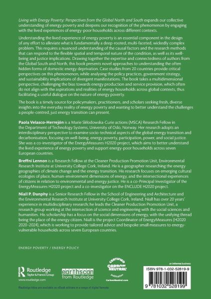 Understanding the lived experience of energy poverty is an essential component in the design of any effort to alleviate what is fundamentally a deep-rooted, multi-faceted, wickedly complex problem. This requires a nuanced understanding of the causal factors and the research methods that can respond to the flexible spatial and temporal nature of the condition, as well as its wellbeing and justice implications. Drawing together the expertise and connectedness of authors from the Global South and North, this book presents novel approaches to understanding the often hidden forms of domestic energy deprivation. Case studies from 20 countries provide critical perspectives on this phenomenon while analysing the policy practices, government strategy, and sustainability implications of divergent manifestations. The book takes a multidimensional perspective, challenging the bias towards energy production and service provision, which often do not align with the aspirations and realities of energy households across global contexts, thus facilitating a useful dialogue on the nature of energy poverty.