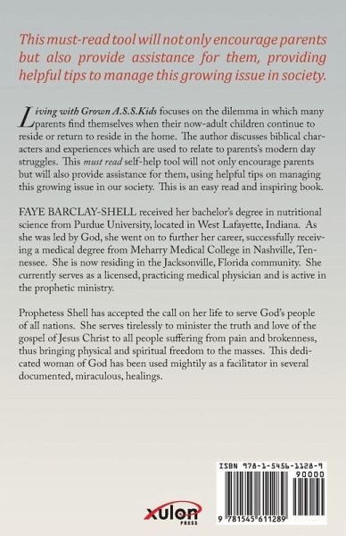Living with Grown A.S.S.Kids focuses on the dilemma in which many parents find themselves when their now-adult children continue to reside or return to reside in the home. The author discusses biblical characters and experiences which are used to relate to parents's modern day struggles. This must read self-help tool will not only encourage parents but will also provide assistance for them, using helpful tips on managing this growing issue in our society. This is an easy read and inspiring book. FAYE BARCLAY-SHELL received her bachelor's degree in nutritional science from Purdue University, located in West Lafayette, Indiana. As she was led by God, she went on to further her career, successfully receiving a medical degree from Meharry Medical College in Nashville, Tennessee. She is now residing in the Jacksonville, Florida community. She currently serves as a licensed, practicing medical physician and is active in the prophetic ministry. Prophetess Shell has accepted the call on her life to serve God's people of all nations. She serves tirelessly to minister the truth and love of the gospel of Jesus Christ to all people suffering from pain and brokenness, thus bringing physical and spiritual freedom to the masses. This dedicated woman of God has been used mightily as a facilitator in several documented, miraculous, healings.