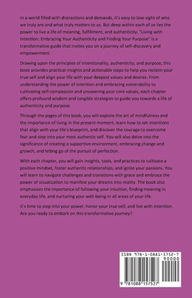 In a world filled with distractions and demands, it's easy to lose sight of who we truly are and what truly matters to us. But deep within each of us lies the power to live a life of meaning, fulfillment, and authenticity. "Living with Intention: Embracing Your Authenticity and Finding Your Purpose" is a transformative guide that invites you on a journey of self-discovery and empowerment. Drawing upon the principles of intentionality, authenticity, and purpose, this book provides practical insights and actionable steps to help you reclaim your true self and align your life with your deepest values and desires. From understanding the power of intention and embracing vulnerability to cultivating self-compassion and uncovering your core values, each chapter offers profound wisdom and tangible strategies to guide you towards a life of authenticity and purpose. Through the pages of this book, you will explore the art of mindfulness and the importance of living in the present moment, learn how to set intentions that align with your life's blueprint, and discover the courage to overcome fear and step into your most authentic self. You will also delve into the significance of creating a supportive environment, embracing change and growth, and letting go of the pursuit of perfection. With each chapter, you will gain insights, tools, and practices to cultivate a positive mindset, foster authentic relationships, and ignite your passions. You will learn to navigate challenges and transitions with grace and embrace the power of visualization to manifest your dreams into reality. The book also emphasizes the importance of following your intuition, finding meaning in everyday life, and nurturing your well-being in all areas of your life. "Living with Intention: Embracing Your Authenticity and Finding Your Purpose" serves as a roadmap for anyone seeking a deeper connection with themselves and a more purposeful existence. Whether you are at a crossroads in your life, yearning for personal growth, or simply seeking guidance on living a more meaningful and fulfilling life, this book will inspire and empower you to embrace your authenticity and create a life well lived. It's time to step into your power, honor your true self, and live with intention. Are you ready to embark on this transformative journey?