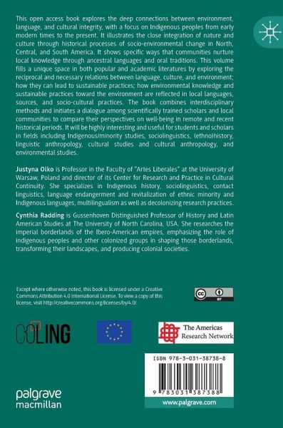 This open access book explores the deep connections between environment, language, and cultural integrity, with a focus on Indigenous peoples from early modern times to the present. It illustrates the close integration of nature and culture through historical processes of environmental change in North, Central, and South America and the nurturing of local knowledge through ancestral languages and oral traditions. This volume fills a unique space by bringing together the issues of environment, language and cultural integrity in Latin American historical and cultural spheres. It explores the reciprocal and necessary relations between language/culture and environment; how they can lead to sustainable practices; how environmental knowledge and sustainable practices toward the environment are reflected in local languages, local sources and local socio-cultural practices. The book combines interdisciplinary methods and initiates a dialogue among scientifically trained scholars and local communities to compare their perspectives on well-being in remote and recent historical periods and it will be of interest to students and scholars in fields including sociolinguistics, (ethno)history, linguistic anthropology, cultural studies and cultural anthropology, environmental studies and Indigenous/minority studies.