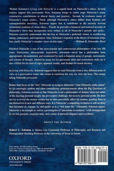 Friedrich Nietzsche is one of the most popular and controversial philosophers of the last 150 years. Narcissistic, idiosyncratic, hyperbolic, irreverent-never has a philosopher been appropriated, deconstructed, and scrutinized by such a disparate array of groups, movements, and schools of thought. Adored by many for his passionate ideas and iconoclastic style, he is also vilified for his lack of rigor, apparent cruelty, and disdain for moral decency. In Living with Nietzsche, Solomon suggests that we read Nietzsche from a very different point of view, as a provocative writer who means to transform the way we view our lives. This means taking Nietzsche personally. Rather than focus on the "true" Nietzsche or trying to determine "what Nietzsche really meant" by his seemingly random and often contradictory pronouncements about "the Big Questions" of philosophy, Solomon reminds us that Nietzsche is not a philosopher of abstract ideas but rather of the dazzling personal insight, the provocative challenge, the incisive personal probe. He does not try to reveal the eternal verities but he does powerfully affect his readers, goading them to see themselves in new and different ways. It is Nietzsche's compelling invitation to self-scrutiny that fascinates us, engages us, and guides us to a "rich inner life." Ultimately, Solomon argues, Nietzsche is an example as well as a promulgator of "passionate inwardness," a life distinguished by its rich passions, exquisite taste, and a sense of personal elegance and excellence.