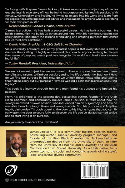 We are not meant to just live; we are meant to live on purpose. We are here to use our gifts and talents, find our passion, and live life abundantly. But how? How do we find our purpose in life? How do we unlock those innate gifts and talents that help us carry out our purpose? How do we find a path in life that gets us out of bed every morning and allows us to make an impact in a way that leaves an enduring legacy? This book is a journey through how one man found his purpose and ignited his passion; it is not a roadmap, but a story that is meant to inspire you to finally start living your life on purpose. In this book, bestselling author James Jackson, III chronicles his life and how he came to find his purpose-as a community builder, speaker, connector, and founder of The Utah Black Chamber. He graciously opens the doors to his past and allows the reader to step over the threshold and join him on his life's journey. Along the way, he outlines what the word purpose means to him and how he believes that passion is an essential component to attaining it. From his childhood to the present day, James talks about how he slowly uncovered his own passion, who influenced him on his journey, and how he was able to endure tough times and wrong turns to finally find his purpose and fully live into it, day-by-day. This is the first time James shares his journey about who he is at his core and how he came to be that person. He shares his story now in the hopes of inspiring others who are searching for their own path by teaching them how they can find their passion, grow their influence, and maximize their endurance to pursue their purpose in life. This book is an invitation to a purpose-filled life; it is for you if:You are struggling to find a rhythm for your life You are trying to discover what line of work you should be in You've hit a wall and looking for ways to push through You've reached a peak, but know there's something more You're looking to LIVE LIFE WITH PURPOSE We all have a story to tell. And we can all inspire others with that story. This is the story of one man's journey. And he hopes, through opening the door to his life, that you can finally open the door to yours fully, to discover the life you've always wanted to live, and to start living it on purpose. Are you ready to accept the invitation?