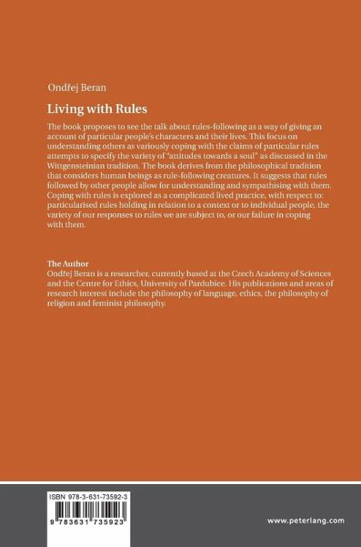 The book proposes to see the talk about rules-following as a way of giving an account of particular people's characters and their lives. This focus on understanding others as variously coping with the claims of particular rules attempts to specify the variety of "attitudes towards a soul" as discussed in the Wittgensteinian tradition. The book derives from the philosophical tradition that considers human beings as rule-following creatures. It suggests that rules followed by other people allow for understanding and sympathising with them. Coping with rules is explored as a complicated lived practice, with respect to: particularised rules holding in relation to a context or to individual people, the variety of our responses to rules we are subject to, or our failure in coping with them.
