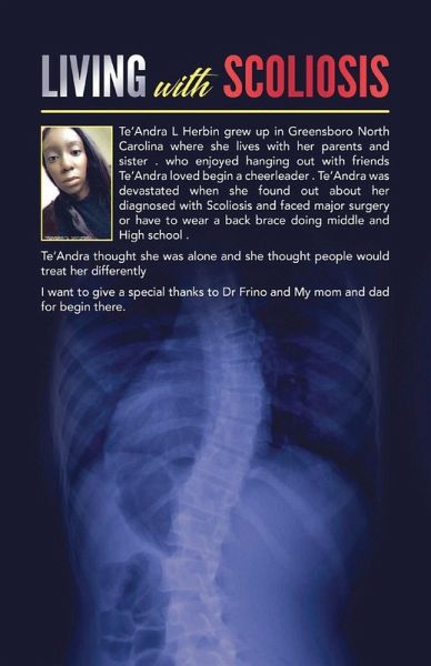 Living with Scolisis is about how this little girl name Te'Andra L Herbin Grew up in Greensboro North Carolina . who enjoyed hanging out with her friends Te'Andra Loved begin a Cheerleader . TeAndra Was Devasted when she found out that she was diagnosed with scolisis and faced major surgery ,or having to wear a back brace doing middle and high School. when she was only a 11 years old. how all her friends talked about her they had laugh and started to builled her through elementary,Middle ,High school .how it has affected her now Te'Andra Felt that her body betrayed her and she didn't feel normal . told from Honest perspective this heartmealting story recounts the trials of begin a preteen growing up with scoliosis