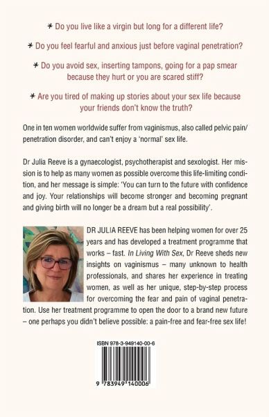 Do you live like a virgin but long for a different life?¿ ¿Do you feel fearful and anxious just before vaginal penetration? Do you avoid sex, inserting tampons, going for a pap smear because they hurt or you are scared stiff? Are you tired of making up stories about your sex life because your friends don't know the truth? ¿ ¿One in ten women worldwide suffer from vaginismus, also called pelvic pain/penetration disorder, and can't enjoy a 'normal' sex life. Dr Julia Reeve is a gynaecologist, psychotherapist and sexologist. Her mission is to help as many women as possible overcome this life-limiting condition, and her message is simple: 'You can turn to the future with confidence and joy. Your relationships will become stronger and becoming pregnant and giving birth will no longer be a dream but a real possibility'. Dr Julia Reeve has been helping women for over 25 years and has developed a treatment programme that works - fast. In Living With Sex, Dr Reeve sheds new insights on vaginismus - many unknown to health professionals, and shares her experience in treating women, as well as her unique, step-by-step process for overcoming the fear and pain of vaginal penetration. Use her treatment programme to open the door to a brand new future - one perhaps you didn't believe possible: ¿ ¿a pain-free and fear-free sex life!