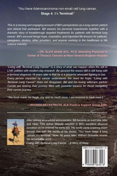 "You have Adenocarcinoma non-small cell lung cancer, Stage 4, it's Terminal!" This is a moving and engaging account of Bill's perspectives as a lung cancer patient and clinical trial participant. Bill weaves his personal experiences together with a dramatic story of breakthrough targeted treatments for patients with terminal lung cancer. Bill's account brings hope, inspiration, and important life lessons for patients, caregivers, doctors, other providers, and anyone working in the healthcare or life science industry. DR. ALICE SHAW, M.D., Ph.D. Attending Physician inCenter of Thoracic Cancers at Mass General Brigham Hospital Only one who has heard those crushing words, "You have six months to two years to live!" can understand its devastating impact on one's psychic. For Bill, all travel plans were put on the proverbial "back burner" and sadly thrown into the trash-two years of hellacious chemo seemly nothing short of poison recked havoc throughout his body. While lying on his sofa, too weak to climb the stairsteps to his bedroom, a voice from a lovely young lady on his T.V. quietly proclaimed; I have adenocarcinoma non-small cell lung cancer, and it's melting away. This led to a conversation with Dr. Alice Shaw and a chance for life. With the introduction to the wonderful world of ALK drugs, he now follows his dreams of world travel while "Living with Terminal Lung Cancer." The urge to see this big beautiful planet has returned as strong as ever as he calls to Connie, "Pack the bags!" Travel they have! All seven continents, including all 63 of our fantastic National Parks (including Pago Pago N.P.).