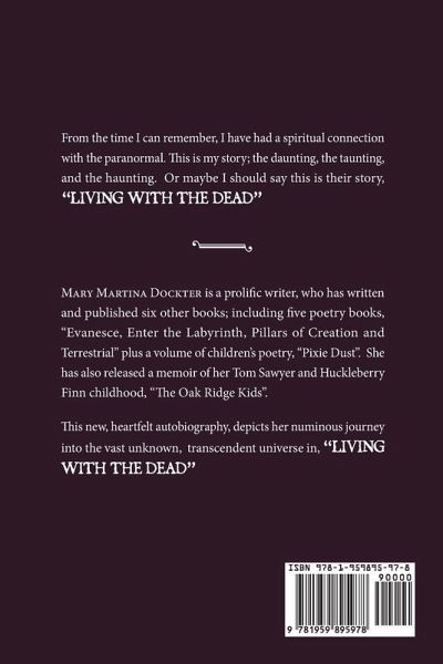 From the time I can remember, I have had a spiritual connection with the paranormal. Th is is my story; the daunting, the taunting, and the haunting. Or maybe I should say this is their story, "LIVING WITH THE DEAD" Mary Martina Dockter is a prolifi c writer, who has written and published six other books; including five poetry books, "Evanesce, Enter the Labyrinth, Pillars of Creation and Terrestrial" plus a volume of children's poetry, "Pixie Dust". She has also released a memoir of her Tom Sawyer and Huckleberry Finn childhood, "The Oak Ridge Kids". Th is new, heartfelt autobiography, depicts her numinous journey into the vast unknown, transcendent universe in, "LIVING WITH THE DEAD"