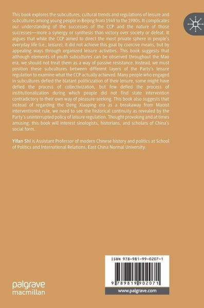 This book explores the subcultures, cultural trends and regulations of leisure and subcultures among young people in Beijing from 1949 to the 1980s. It complicates our understanding of the successes of the CCP and the nature of those successes-more a synergy or synthesis than victory over society or defeat. It argues that while the CCP aimed to direct the most private sphere in people's everyday life (i.e., leisure), it did not achieve this goal by coercive means, but by appealing ways through organized leisure activities. This book suggests that although elements of youth subcultures can be observed throughout the Mao era, we should not treat them as a way of passive resistance. Instead, we must position these subcultures between different layers of the Party's leisure regulation to examine what the CCP actually achieved. Many people who engaged in subcultures defied the blatant politicization of their leisure, some might have defied the process of collectivization, but few defiedthe process of institutionalization during which people did not find state intervention contradictory to their own way of pleasure-seeking. This book also suggests that instead of regarding the Deng Xiaoping era as a breakaway from Maoist interventionist rule, we need to see the historical continuity as revealed by the Party's uninterrupted policy of leisure regulation. Thought provoking and at times amusing, this book will interest sinologists, historians, and scholars of China's social form.