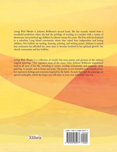Jolainne BoRienne presents the reader with a collection of over fifty original poems as well as a number of pictures of some of her original paintings. They represent a variety of examples intending to honor her experiences recognizing God in all areas of her life. It is hoped that they will strike familiarity with one's own experiences and encourage you to see more deeply into seemingly small things as well as see through larger events in your life to recognize the essence of God in them all. Jolainne believes that by sharing one's gifts we can also give greater glory to God. The structure of Living With Wonder is divided into five basic sections: God in Nature, God During Worship (community and personal), God Through Painting, God in People, and God at Home and Away. The poetry is not intended to be formal poetry, but represents feelings and emotions inspired by the Spirit as Jolainne examined events in her life. As such they became special gifts. In the section on painting, Jolainne has given a few words of background to each picture, but it is hoped that each viewer will see the Spirit's work in their own individual way. Together the poetry and artwork represent special joyful gifts, which she hopes you will enjoy, too.