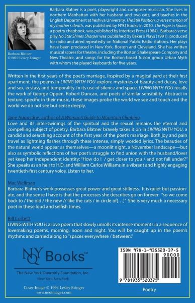 Written in the first years of the poet's marriage, inspired by a magical yard at their first apartment, the poems in LIVING WITH YOU explore mysteries of beauty and decay, love and sex, ecstasy and temporality. In its use of silence and space, LIVING WITH YOU recalls the work of George Oppen, Robert Duncan, and poets of similar sensibility. Abstract in texture, specific in their music, these images probe the world we see and touch and the world we do not see but sense deeply.