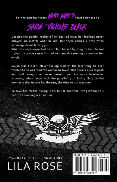 For the past four years, Nary May's heart belonged to Saxon "Vicious" Black. Despite the painful reality of unrequited love, her feelings never strayed, no matter what he did. But there comes a time when surviving means letting go. What she never expected was to find herself fighting for her life and trying to survive a new form of torment threatening to swallow her whole. Saxon was broken. Never feeling worthy, the last thing he ever wanted to do was taint the woman he loved. But it was easier to push and walk away than leave himself open for more heartache. However, when faced with the possibility of losing Nary to the monsters that invade her dreams, the time to run was over. To save her means risking it all, but to continue living without his heart was no longer an option. ***WARNING: contains explicit sexual situations, violence, disturbingly sensitive and taboo subjects, offensive language, and very mature topics. Recommended for age 18 years and up***
