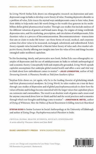 In Living Worth Stefan Ecks draws on ethnographic research on depression and antidepressant usage in India to develop a new theory of value. Framing depressive disorder as a problem of value, Ecks traces the myriad ways antidepressants come to have value, from their ability to help make one's life worth living to the wealth they generate in the multibillion-dollar global pharmaceutical market. Through case studies that include analyses of the different valuation of generic and brand-name drugs, the origins of rising worldwide depression rates, and the marketing, prescription, and circulation of antidepressants, Ecks theorizes value as a process of biocommensuration. Biocommensurations-transactions that aim or claim to make life better-are those forms of social, medical, and corporate actions that allow value to be measured, exchanged, substituted, and redistributed. Ecks's theory expands value beyond both a Marxist labor theory of value and a free market subjective theory, thereby offering new insights into how the value of lives and things become entangled under neoliberal capitalism.