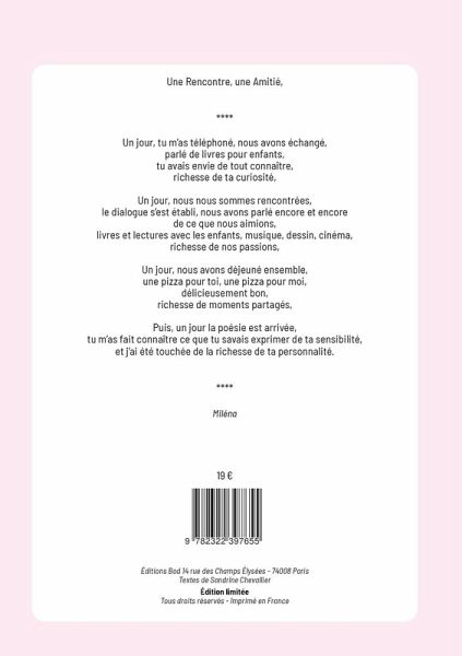 Un livre d'une grande richesse en émotions, fait de rencontre et d'amitié.Une sensibilité unique, une partition de musique. « A vous qui aimez les poèmes, je vous souhaite la bienvenue dans mon univers ».Un monde à part, douillet et protégé. Il est bon de s'y ressourcer, d'y papillonner et d'y respirer.Une perle à partager, de la personnalité en toute légèreté.Sérénité.