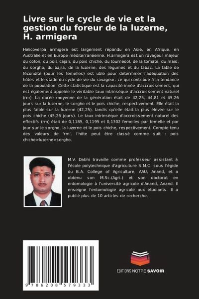 Helicoverpa armigera est largement répandu en Asie, en Afrique, en Australie et en Europe méditerranéenne. H.armigera est un ravageur majeur du coton, du pois cajan, du pois chiche, du tournesol, de la tomate, du maïs, du sorgho, du bajra, de la luzerne, des légumes et du tabac. La table de fécondité (pour les femelles) est utile pour déterminer l'adéquation des hôtes et le stade du cycle de vie du ravageur, ce qui contribue à la tendance de la population. Cette statistique est la capacité innée d'accroissement, qui est également appelée le véritable taux intrinsèque d'accroissement naturel (rm). La durée moyenne de la génération était de 42,25, 44,81 et 45,26 jours sur la luzerne, le sorgho et le pois chiche, respectivement. Elle était la plus faible sur la luzerne (42,25), tandis qu'elle était la plus élevée sur le pois chiche (45,26 jours). Le taux intrinsèque d'accroissement naturel des effectifs (rm) était de 0,1185, 0,1195 et 0,1302 femelles par femelle et par jour sur le sorgho, la luzerne et le pois chiche, respectivement. Compte tenu des valeurs de 'rm', l'hôte peut être classé comme suit : pois chiche>luzerne>sorgho.