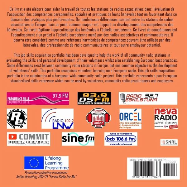 Ce livret bilingue permet l'évaluation et la validation de l'acquisition des compétences personnelles, sociales et pratiques des bénévoles des radios associatives et communautaires en Europe. Il est l'aboutissement d'un projet à l'échelle européenne mené par des radios. Il peut être considéré comme une référence harmonisée de compétences pouvant être utilisée par des bénévoles, des professionnels de radio communautaires et tout autre employeur potentiel. The job skills acquisition portfolio has been developed to help the work of all community radio stations in evaluating the skills and personal development of their volunteers whilst also establishing European best practices. This portfolio recognises volunteer learning on a European scale. This job skills acquisition portfolio is the culmination of a European-wide community radio project. This portfolio represents a pan-European standardised skills reference which can be used by volunteers, community radio practitioners and employers.