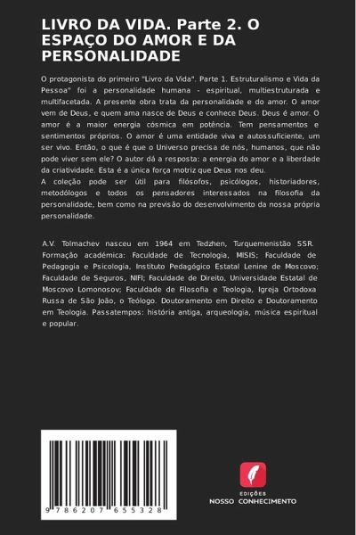 O protagonista do primeiro "Livro da Vida". Parte 1. Estruturalismo e Vida da Pessoa" foi a personalidade humana - espiritual, multiestruturada e multifacetada. A presente obra trata da personalidade e do amor. O amor vem de Deus, e quem ama nasce de Deus e conhece Deus. Deus é amor. O amor é a maior energia cósmica em potência. Tem pensamentos e sentimentos próprios. O amor é uma entidade viva e autossuficiente, um ser vivo. Então, o que é que o Universo precisa de nós, humanos, que não pode viver sem ele? O autor dá a resposta: a energia do amor e a liberdade da criatividade. Esta é a única força motriz que Deus nos deu.A coleção pode ser útil para filósofos, psicólogos, historiadores, metodólogos e todos os pensadores interessados na filosofia da personalidade, bem como na previsão do desenvolvimento da nossa própria personalidade.