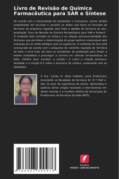 De acordo com a necessidade de estudantes e instrutores, temos estado empenhados em escrever e compilar os dados com base no Conselho de Farmácia do programa regulado pela Índia e aptidão de farmácia de pós-graduação "Livro de Revisão de Química Farmacêutica para SAR e Síntese". O conteúdo está centrado na síntese e na relação estrutura-atividade dos fármacos que permitem a determinação do grupo químico responsável pela evocação de um efeito biológico alvo no organismo. O conteúdo do livro está estruturado de acordo com o programa do conselho regulado de farmácia da Índia e será mais útil para os estudantes de graduação para limpar o exame competitivo e prosseguir a carreira em ciências farmacêuticas na Índia. Contém duas secções: a secção I é sobre a relação estrutura-atividade e a secção II é sobre o processo de síntese, juntamente com as utilizações.