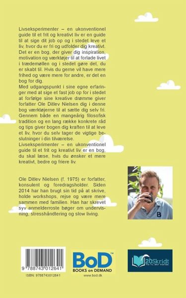 "Livseksperimenter - en ukonventionel guide til et frit og kreativt liv" er en guide til at sige dit job op og i stedet leve et liv, hvor du er fri og udfolder dig kreativt. Det er en bog, der giver dig inspiration, motivation og konkrete værktøjer til at forlade livet i trædemøllen og i stedet gøre det, du er skabt til. Hvis du gerne vil have mere frihed, udfolde dig kreativt og være mere for andre, er det en bog for dig. Med udgangspunkt i sine egne erfaringer med at sige et godt job op for i stedet at forfølge sine kreative drømme giver forfatter Ole Ditlev Nielsen dig i denne bog værktøjerne til at sætte dig selv fri. Bogen er den, du har brug for, hvis du vil leve et liv med kreativ frihed. Et liv, hvor du selv tager de vigtige beslutninger i din tilværelse. "Livseksperimenter - en ukonventionel fuide til et frit og kreativt liv" trækker på en lang filosofisk tradition, fra Friedrich Schiller over Viktor Frankl til Steven Pressfield. Den giver dig perspektiver på, hvad der giver mening i livet, og den introducerer dig samtidig til et nyt arbejdsmarked, hvor du bringer dine kreative kompetencer i spil på nye og effektive måder. Det er den bog, du skal læse, hvis du ønsker et bedre og friere liv.