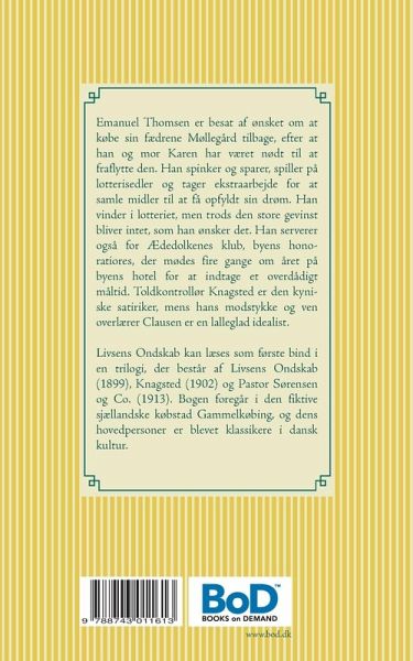 Emanuel Thomsen er besat af ønsket om at købe sin fædrene Møllegård tilbage, efter at han og mor Karen har været nødt til at fraflytte den. Han spinker og sparer, spiller på lotterisedler og tager ekstraarbejde for at samle midler til at få opfyldt sin drøm. Han vinder i lotteriet, men trods den store gevinst bliver intet, som han ønsker det. Han serverer for Ædedolkenes klub, byens honoratiores, der mødes fire gange om året på byens hotel (Prindsen) for at indtage et overdådigt måltid. Toldkontrollør Knagsted er den kyniske satiriker, mens hans modstykke og ven overlærer Clausen er lalleglad idealist. "Livsens Ondskab" kan læses som første bind i en trilogi, der består af "Livsens Ondskab" (1899), "Knagsted" (1902) og "Pastor Sørensen og Co." (1913). Bogen foregår i den fiktive sjællandske købstad Gammelkøbing, og dens hovedpersoner er blevet klassikere i dansk kultur.