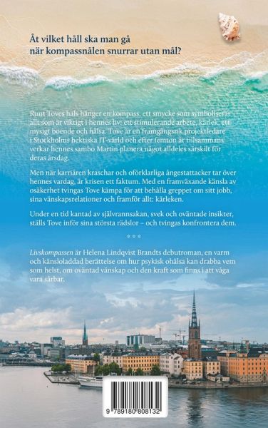 Åt vilket håll ska man gå när kompassnålen snurrar utan mål? Runt Toves hals hänger en kompass, ett smycke som symboliserar allt som är viktigt i hennes liv: ett stimulerande arbete, kärlek, ett mysigt boende och hälsa. Tove är en framgångsrik projektledare i Stockholms hektiska IT-värld och efter femton år tillsammans verkar hennes sambo Martin planera något alldeles särskilt för deras årsdag. Men när karriären kraschar och oförklarliga ångestattacker tar över hennes vardag, är krisen ett faktum. Med en framväxande känsla av osäkerhet tvingas Tove kämpa för att behålla greppet om sitt jobb, sina vänskapsrelationer och framför allt: kärleken. Under en tid kantad av självrannsakan, svek och oväntade insikter, ställs Tove inför sina största rädslor, och tvingas konfrontera dem. Livskompassen är Helena Lindqvist Brandts debutroman, en varm och känsloladdad berättelse om hur psykisk ohälsa kan drabba vem som helst, om oväntad vänskap och den kraft som finns i att våga vara sårbar.