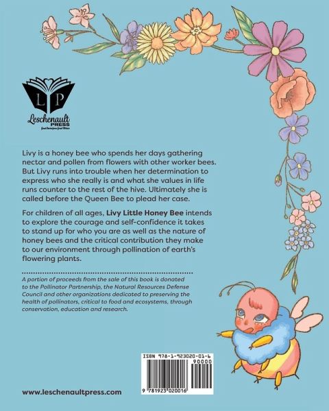 Livy is a honey bee who spends her days gathering nectar and pollen from flowers with other worker bees. But Livy runs into trouble when her determination to express who she really is and what she values in life runs counter to the rest of the hive. Ultimately she is called before the Queen Bee to plead her case. For children of all ages, Livy Little Honey Bee intends to explore the courage and self-confidence it takes to stand up for who you are as well as the nature of honey bees and the critical contribution they make to our environment through pollination of earth's flowering plants. A portion of proceeds from the sale of this book is donated to the Pollinator Partnership, the Natural Resources Defense Council and other organizations dedicated to preserving the health of pollinators, critical to food and ecosystems, through conservation, education and research.