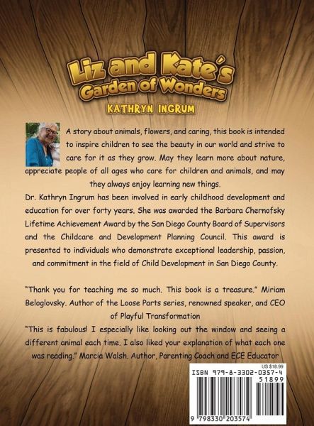 A story about animals, flowers, and caring, this book is intended to inspire children to see the beauty in our world and strive to care for it as they grow. May they learn more about nature, appreciate people of all ages who care for children and animals, and may they always enjoy learning new things. Dr. Kathryn Ingrum has been involved in early childhood development and education for over forty years. She was awarded the Barbara Chernofsky Lifetime Achievement Award by the San Diego County Board of Supervisors and the Childcare and Development Planning Council. This award is presented to individuals who demonstrate exceptional leadership, passion, and commitment in the field of Child Development in San Diego County. "Thank you for teaching me so much. This book is a treasure." Miriam Beloglovsky. Author of the Loose Parts series, renowned speaker, and CEO of Playful Transformation "This is fabulous! I especially like looking out the window and seeing a different animal each time. I also liked your explanation of what each one was reading." Marcia Walsh. Author, Parenting Coach and ECE Educator