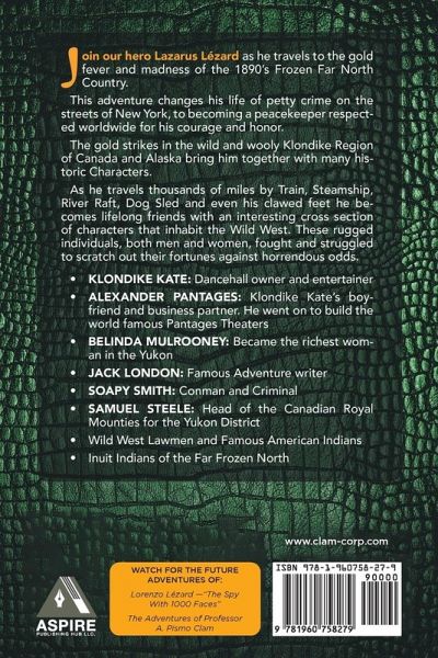 Join our hero Lazarus Lézard as he travels to the gold fever and madness of the 1890s Frozen Far North Country. This adventure changes his life of petty crime on the streets of New York to becoming a peacekeeper respected worldwide for his courage and honor.The gold strikes in the wild and wooly Klondike Region of Canada and Alaska bring him together with many historical characters. As he travels thousands of miles by Train, Steamship, River Raft, Dog Sled, and even his clawed feet, he be- becomes lifelong friends with an interesting cross-section of characters that inhabit the Wild West. These rugged individuals, both men and women, fought and struggled to scratch out their fortunes against horrendous odds. * KLONDIKE KATE: Dancehall owner and entertainer * ALEXANDER PANTAGES: Klondike Kate's boyfriend and business partner. He went on to build the world-famous Pantages Theaters. * BELINDA MULROONEY: Richest woman in the Yukon * JACK LONDON: Famous Adventure writer * SOAPY SMITH: Conman and Criminal * SAMUEL STEELE: Head of the Canadian Royal Mounties for the Yukon District * Wild West Lawmen and Famous American Indians Inuit Indians of the Far Frozen North