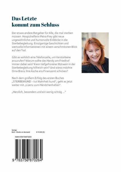 Das Letzte kommt zum Schluss Der etwas andere Ratgeber für Alle, die mal sterben müssen. Hospizhelferin Petra Frey gibt neue ungewöhnliche und humorvolle Einblicke in die Sterbebegleitung. Einzigartige Geschichten und wertvolle Informationen mit einem verschmitzten Blick auf den Tod. Gibt es wirklich eine Telefonzelle, um Verstorbene anzurufen? Warum sollte das Handy am Friedhof immer dabei sein? Kann tiefgefrorener Rotwein in der Sterbebegleitung hilfreich sein? Und wieso möchte Oma Brenz ihre Asche ans Finanzamt schicken?Nach dem großem Erfolg des ersten Buches STERBEMUND tut Wahrheit kund, geht es jetzt weiter mit Lizenz zum Händchenhalten.Herzlich, besonders und ein wenig schräg.