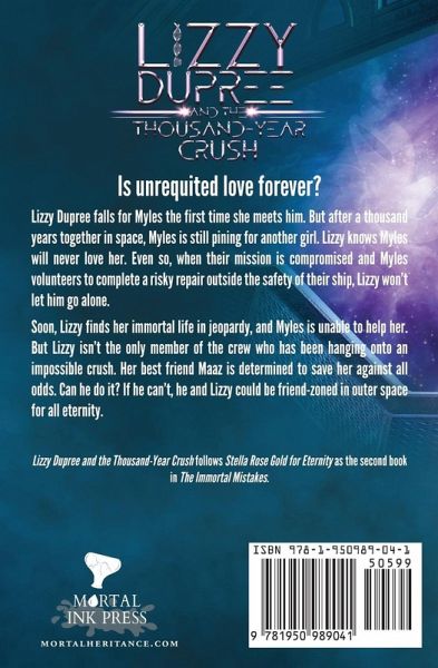 Is unrequited love forever? Lizzy Dupree falls for Myles the first time she meets him. But after a thousand years together in space, Myles is still pining for another girl. Lizzy knows Myles will never love her. Even so, when their mission is compromised and Myles volunteers to complete a risky repair outside the safety of their ship, Lizzy won't let him go alone. Soon, Lizzy finds her immortal life in jeopardy, and Myles is unable to help her. But Lizzy isn't the only member of the crew who has been hanging onto an impossible crush. Her best friend Maaz is determined to save her against all odds. Can he do it? If he can't, he and Lizzy could be friend-zoned in outer space for all eternity. Lizzy Dupree and the Thousand-Year Crush follows Stella Rose Gold for Eternity as the second book in The Immortal Mistakes.