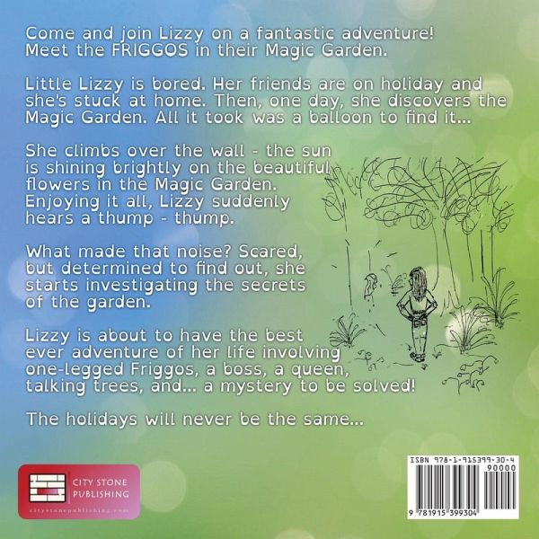 Come and join Lizzy on a fantastic adventure! Meet the FRIGGOS in their Magic Garden. Little Lizzy is bored. Her friends are on holiday and she's stuck at home. Then, one day, she discovers the Magic Garden. All it took was a balloon to find it... She climbs over the wall - the sun is shining brightly on the beautiful flowers in the Magic Garden. Enjoying it all, Lizzy suddenly hears a thump - thump. What made that noise? Scared, but determined to find out, Lizzy starts investigating the secrets of the garden. Lizzy is about to have the best ever adventure of her life involving one-legged Friggos, a boss, a Queen, talking trees, and... a mystery to be solved! The holidays will never be the same... ⭐⭐⭐⭐⭐ What an amazing read. The gorgeous book is packed full of wonderful descriptions that make you feel part of the story. A fantastic children's story. * Stephanie Wellbelove ⭐⭐⭐⭐⭐ This book is from start to finish a fantastic read. From the wonderful characters to the cracking illustrations, it truly is a story that captivates you right from the start. It's not a book you can put down, as you just want to read it all the way through to the end. Although it's a children's book, I am sure adults will also enjoy this read and, hopefully, it will inspire others to let their imagination run wild and create more of the same. It will certainly bring a smile to anyone who has the pleasure of reading it. * Emma M-J