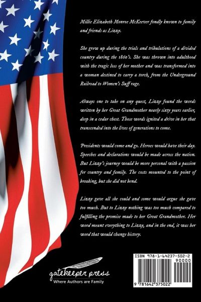 Millie Elizabeth Monroe McKeever was fondly known to family and friends as Lizzy. She grew up during the trials and tribulations of a divided America during the 1860s. She was thrown into adulthood with the tragic loss of her mother and was transformed into a woman destined to carry a torch, from the Underground Railroad to women’s suffrage. Always one to take on any quest, Lizzy found the words written by her great-grandmother nearly sixty years earlier, deep in a cedar chest. Those words ignited a drive in her that transcended into the lives of generations to come. Presidents would come and go. Heroes would have their day. Speeches and declarations would be made across the nation. But Lizzy’s journey would be more personal, with a passion for country and family. The costs mounted to the point of breaking, but she did not bend. Lizzy gave all she could, and some would argue she gave too much. But to Lizzy, nothing was too much compared to fulfilling the promise made to her great-grandmother. Her word meant everything to Lizzy, and in the end, it was her word that would change history.